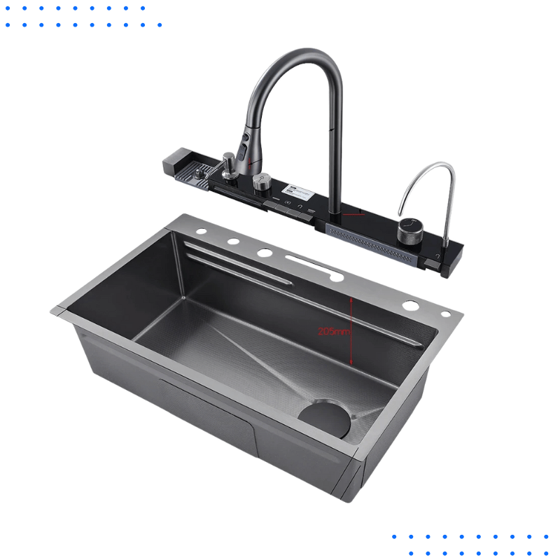 Upgrade your kitchen with this modern stainless steel waterfall sink. Featuring an integrated digital temperature display, soap dispenser, and cup washer, it combines style with smart convenience for everyday use.